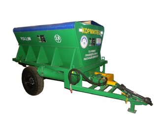 Раздатчик состоит из следующих основных узлов: шасси на двух колесах; рама, на которой установлен бункер для кормов; шнека подающего, расположенного в нижней части бункера; шнека выгрузного; дышла в сборе; гидросистемы и электрооборудования.