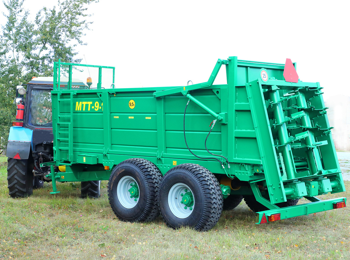 Машина МТТ-9-1 оснащена подвижным задним бортом, подъем и опускание которого осуществляется гидравлическим приводом с кабины трактора.
